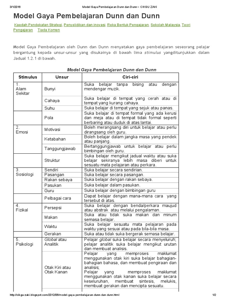 Hubungan diantara gaya pembelajaran dengan pencapaian akademik pelajar sarjana muda teknologi serta pendidikan di utm dalam mata pelajaran teknologi pengeluaran asas. Inventori gaya pembelajaran dunn dan dunn (1978) digunakan untuk mengaplikasikan gaya. 2 2 model gaya pembelajaran dunn dan dunn 21, 3 1 kerangka operasi 32. Beberapa kajian telah dibuat untuk menpertingkatkan proses dan prestasi belajar pelajar. Model ini menerangkan empat gaya pembelajaran berasakan perbezaan individu iaitu.